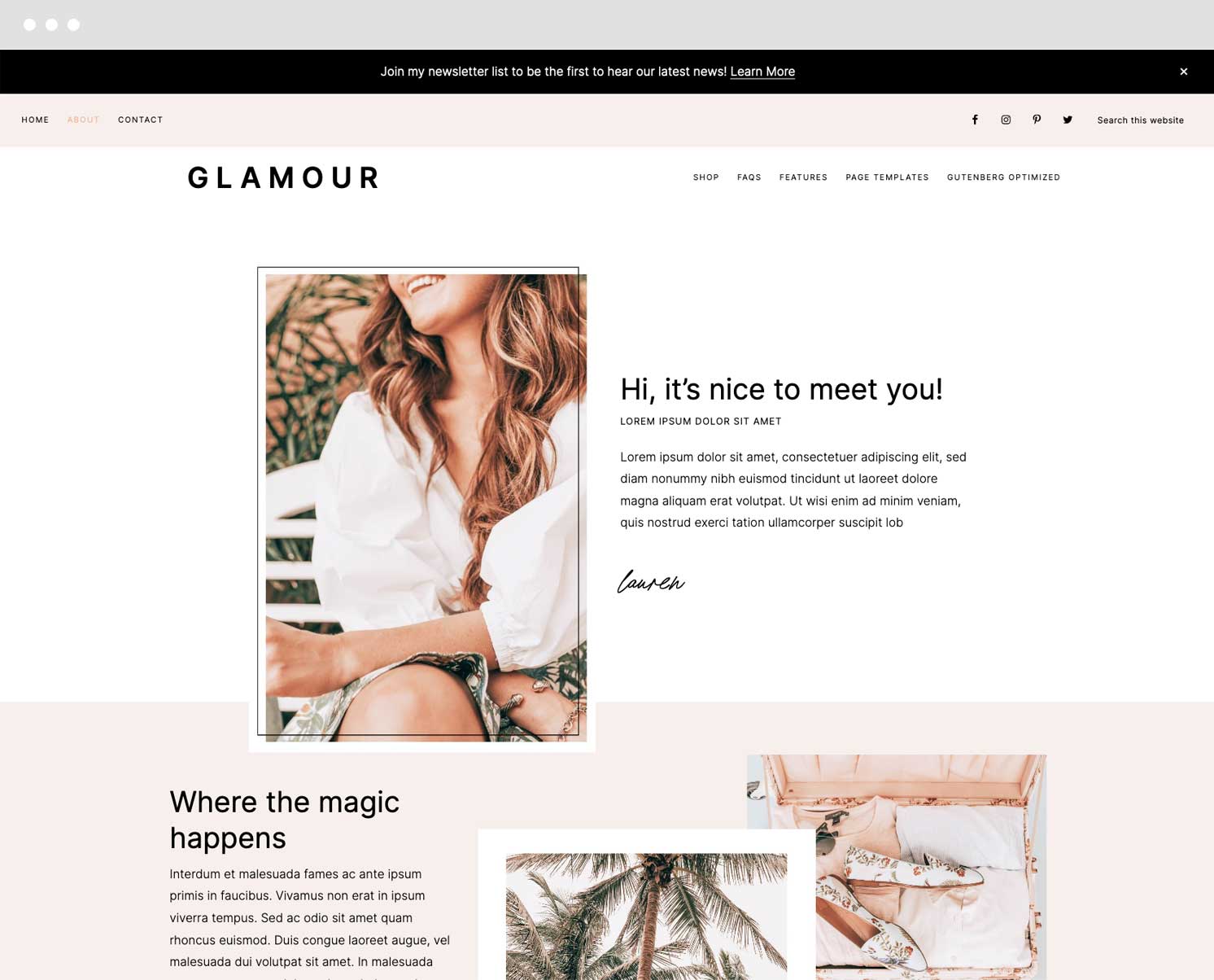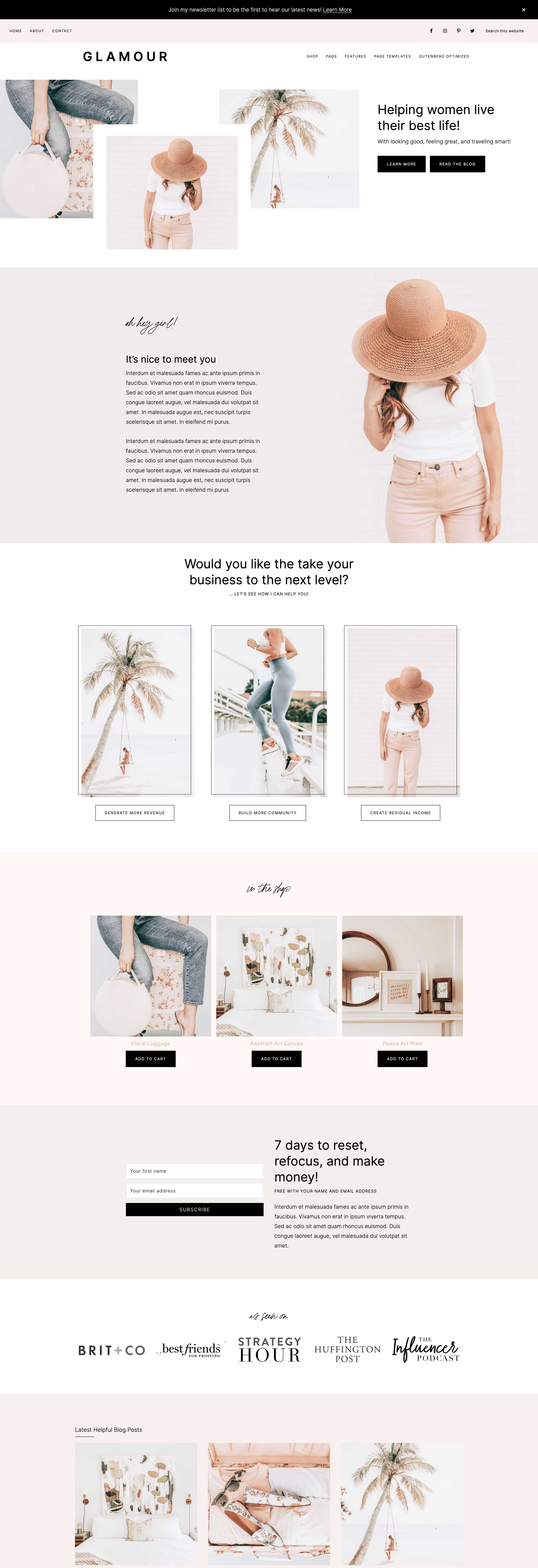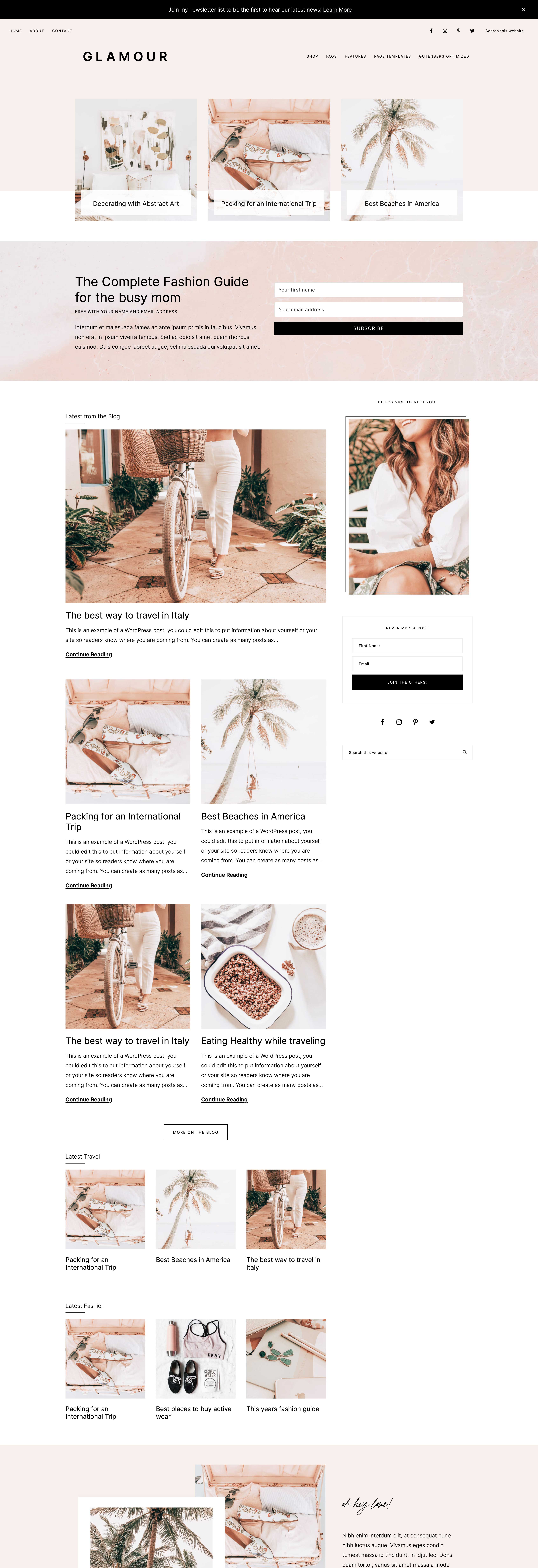 All page designs, including home page options, are built using the Gutenberg editor. This means you aren’t limited to just what you see right here in the demo. You can edit, remove, add… anything you wish! You can truly make Glamour exactly what you need it to be for your blog!